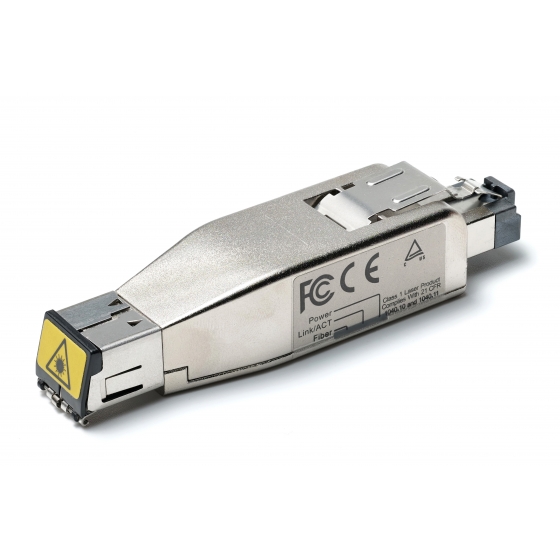 The converter dongle is specifically designed for electrical power substation (IEC 61000-4-5) and PROFINET / TSN (IEC 61158 and IEC 61784). It provides a high level of immunity to interference and long transmission range (up to 10km) in industrial applications by converting the 1000Mbps Ethernet interface to fiber optics (1000Mbps according to 1000Base-X standard).